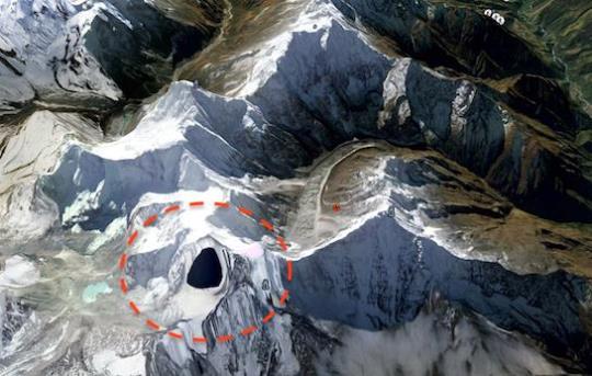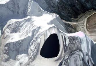 intrare secreta HimalayaAceasta este o mare descoperire făcută de MexicoGeek, pe canalul său de pe Youtube. Precum vedeţi, există o zonă întunecată (neagră) pe Google Maps, în munții Himalaya, în partea Nepalului. Coordonatele acestei zone misterioase întunecate sunt: 27°47’43.40″N / 86°49’6.40″E şi e vorba de vârful Kang Tanga.