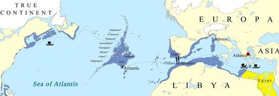 Un alt cercetător, Randall Carson, rezumă foarte bine lucrările științifice care explică cum ar fi putut exista cu adevărat un astfel de pământ și să se scufunde la sfârșitul ultimei ere glaciare, exact când Platon spune că s-a scufundat. Aşadar, e posibil ca Atlantida să facă parte din dorsala medio-atlantică (nu toată, doar partea care înconjoară Insulele Azore). Iată harta probabilă a Atlantidei; este doar o reprezentare artistică, desigur, și nu științifică, dar se bazează în mare măsură pe descrierile lui Platon. Precum se observă şi din harta de mai jos, Atlantida se găsea în mijlocul Oceanului Atlantic: