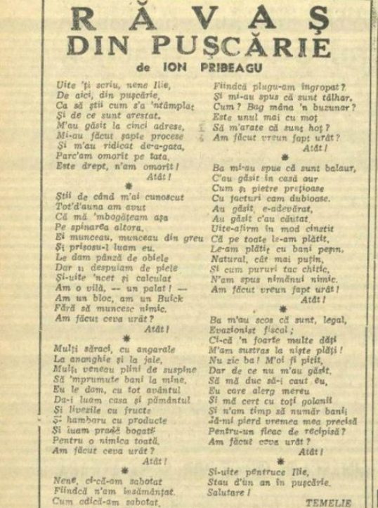 Textul lui Ion Pribeagu se numeşte „Răvaş din puşcărie”, fiind vorba de o scrisoare compusă de un puşcăriaş, care a fost condamnat pentru evaziune fiscală. Vom fi uimiţi cât de mult se aseamănă situaţia cu cea din zilele noastre, deşi au trecut peste 70 de ani de atunci… Am păstrat textul original de atunci, fără nicio modificare.