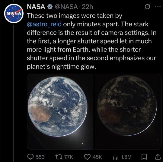 „Aceste două fotografii au fost luate la doar câteva minute distanţă. Diferenţa izbitoare este dată de setările camerei foto. În prima fotografie, un timp de expunere mai lung a lăsat să vină mai multă lumină de la Pământ, în timp ce în a doua fotografie, un timp de expunere mai scurt arată strălucirea planetei noastre din timpul nopţii”.