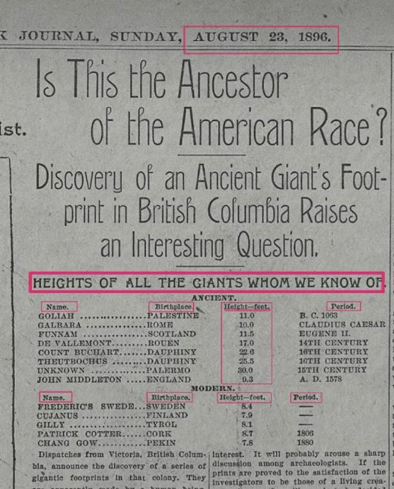 Iată, de exemplu, un extras din Biblioteca Congresului SUA, ziarul „New York Journal”, ediţia 23 august 1896 (îl puteţi găsi AICI – loc.gov). În el ni se prezintă care a fost înălţimea unor „giganţi de care ştim” de-a lungul istoriei. Iată lista lor, aşa cum este prezentată în ziarul respectiv: