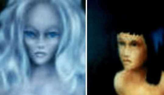 A fost șocul vieții mele pentru că chiar deasupra mea era această femeie, o femeie blondă. Era de culoare albă. Ochii ei erau probabil de două-trei ori mai mari decât ochii oamenilor. Avea pomeți proeminenți și o față îngustă care se îngusta până la o bărbie ascuțită. Pe marginea patului, în colțul patului, era o altă femeie, cu aspect asiatic. Femeia blondă și-a atins stomacul și a arătat spre cer.