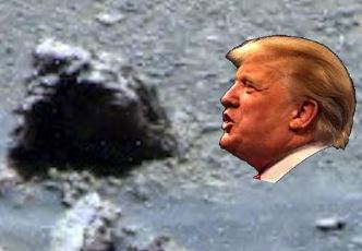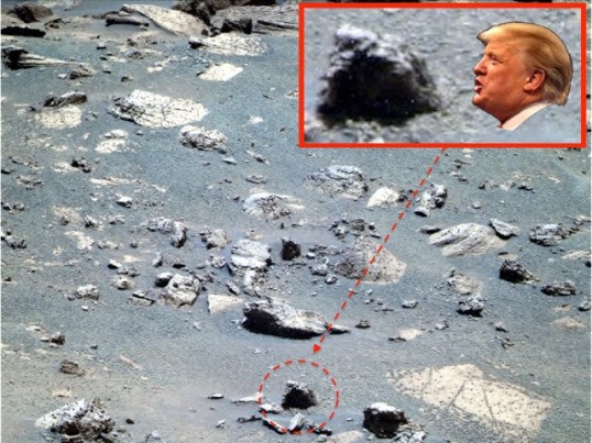 „Am găsit fața lui Trump, într-o poză de pe Marte, fotografiată de robotul Opportunity. Fața, nasul și părul seamănă foarte mult cu cele al lui Trump, şi, de aceea, am vrut să împărtăşesc acest lucru cu voi. Fotografia de mai jos are faţa impregnată pe stâncă, astfel încât puteți vedea detalii incredibile. Este aceasta un simbol că Trump este un extraterestru de pe Marte sau Trump a fost decis de extratereștrii de pe Marte? El pare să aibă o putere magică în vocea lui, care provoacă o isterie în masă şi loialitate”.
