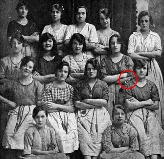 Muncitoarele de fabrică care au făcut această fotografie (toate, cu excepţia uneia) stau cu mâinile încrucişate în faţă atunci când au pozat. Observaţi zona încercuită cu roşu în fotografie? Astfel, se observă degetele unei mâini fantomatice pe umărul uneia din femei… cui aparţine această mână, când toate femeile îşi ţin mâinile încrucişate în faţă!? Parcă e mâna unei fantome…