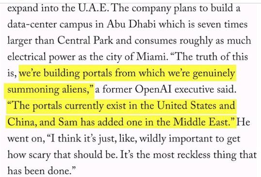Un fost oficial înalt de la corporaţia americană OpenAI a declarat într-un amplu articol de investigație din „The New Yorker” că această companie construiește „portaluri” din care „invocă extratereștri”. Potrivit acestuia, astfel de portaluri există deja în SUA și China, iar fondatorul companiei, Sam Altman, a adăugat recent un alt portal în Orientul Mijlociu: „Adevărul este că noi construim portaluri din care îi chemăm efectiv pe extratereștri. Este cel mai nesăbuit lucru care s-a făcut vreodată”, a spus fostul manager (vedeţi captura de la finalul articolului).