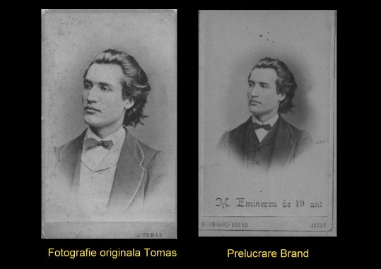 Între cele două imagini ale poetului există însă diferenţe evidente (în afară de culoarea diferită a vestei). Astfel, fotografia realizată de Tomas are dimensiunile de 6 x 9 cm, iar cea semnată de Brand, este ceva mai mare, de 6,5 x 10,5 cm. Fotograful praghez a lucrat în sepia, o culoare ştearsă, fără contrast, în timp ce fotograful ieşean a lucrat în alb-negru, păstrând întocmai proporţiile şi fizionomia poetului, dar schimbând culoarea vestei, pentru a obţine un contrast mai mare. La Tomas, portretul ocupă aproape întreaga suprafaţă de hârtie fotografică, la Brand, portretul este mai mic lăsând loc la baza lui pentru inscripţia: „M. Eminescu de 19 ani”. Umbra, la Tomas este discretă, din spatele capului spre extremităţile fotografiei, iar la Brand, umbra este mai accentuată, apare ca o aureolă în jurul capului.