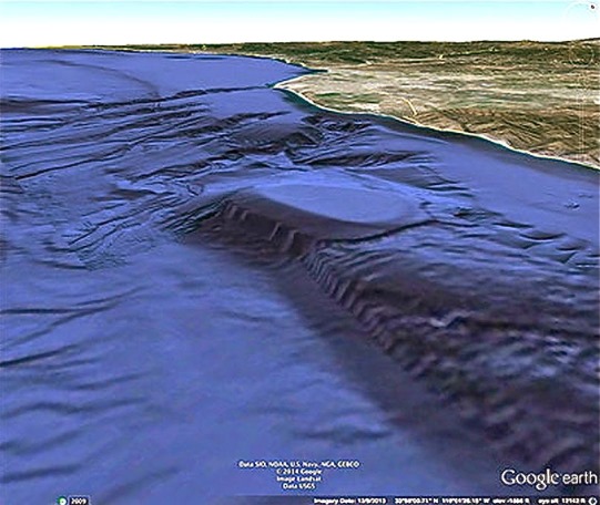 La puțin mai mult de 10 km de coasta Point Dume din Malibu (California / SUA), o structură cu aspect neobișnuit se află pe fundul mării. Pe baza imaginilor obținute pe Google Earth, obiectul de formă ovală are un vârf plat uriaș și ceea ce se aseamănă cu nişte stâlpi sau coloane, care par să dezvăluie intrarea într-un loc mai întunecat. Anomalia se află la aproximativ 700 de metri sub suprafața apei, măsurând aproape 5 km lățime. Ce este mai exact chestia asta?