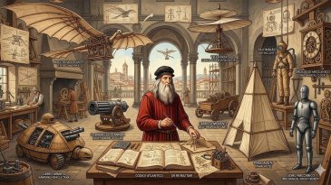 Leonardo da Vinci este plasat în secolul al XV-lea, însă cunoștințele legate de acest nume aparțin unei epoci mult mai avansate. Caietele sale descriu o mașinărie zburătoare bazată pe principiile elicopterului, un vehicul blindat care seamănă cu un tanc modern și un car autopropulsat (un adevărat automobil!) care se mișcă fără forță externă. De asemenea, mai sunt descrise parașute (concepute pentru o coborâre controlată), un costum de scafandru construit pentru supraviețuire subacvatică extinsă și un cavaler mecanic acționat de angrenaje și sisteme interne. Se mai vorbeşte despre arbalete gigantice capabile să lanseze proiectile masive la distanță, despre arme cu mai multe țevi proiectate pentru tragere rapidă și mașini pentru ridicare, rotație și construcții la scară largă – toate cu detalii inginerești extrem de organizate.