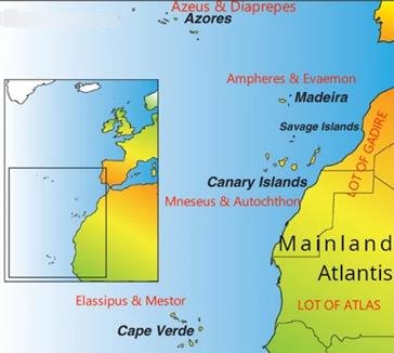 Legendele ne vorbesc despre faptul că, la un moment dat, Atlantida (teritoriu mitic) era formată din 10 regate: 2 regate în partea continentală şi 8 regate în Oceanul Atlantic. Cele două regate continentale erau: Atlas (Mauritania și Sahara Occidentală de astăzi) și Gadeirote (Maroc). Acestea două erau separate de munții Atlas. Cei doi conducători ale celor două regate erau Atlas şi, respectiv, Gadeirus.