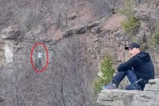 În ea, se observă un băiat care stă cocoţat pe o margine de stâncă, în jos aflându-se o prăpastie extrem de adâncă. Nimic neobişnuit până acum. Dar, dacă ne uităm cu atenţie pe fotografie, în fundalul din spatele fotografiei (înconjurat cu roşu) se observă o siluetă de om, ce pare că stă în picioare pe un perete vertical. Nu, nu e un alpinist, pentru că poziţia corpului nu indică aşa ceva şi, în plus, zona este atât de abruptă acolo, încât nimeni nu s-ar aventura pe acolo.