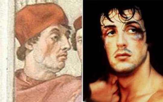 În 1511, Raphael l-a pictat pe papa Grigore al IX-lea. Dar, uitaţi-vă la chipul său, la obrajii săi, la sprâncenele sale, la ochii săi, la nasul său… toate se aseamănă foarte bine cu chipul marelui actor Sylverster Stallone! De parcă Stallone ar fi reîncarnarea papei!