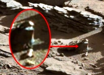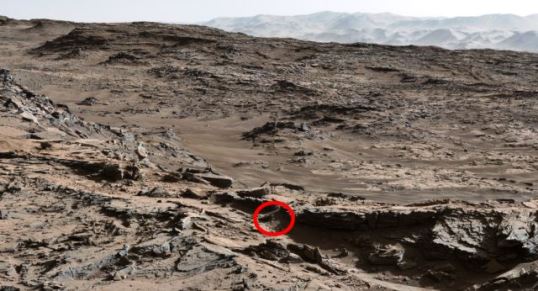 Încă o fotografie ciudată descoperită în arhiva NASA privind planeta Marte! O vedere panoramică de pe platoul Naukluft, de pe muntele Sharp, care se află în interiorul craterului Gale de pe Marte, arată ceva foarte ciudat. În afară de geologie și formele de relief ciudate, imaginea arată ceea ce pare a fi o ființă umanoidă, cu un cap sub formă de con, şi care pare că se plimbă pe jos pe Marte!