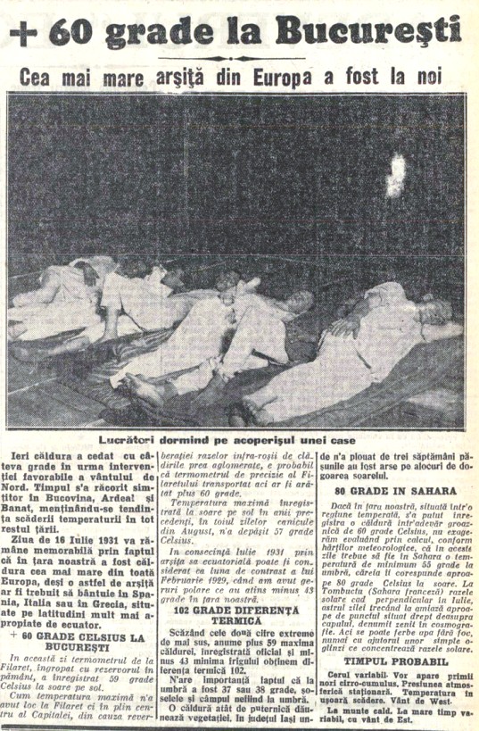 60 de grade în Bucureşti în 1931!? Recordul de temperatură din iulie 1931 a fost însă măsurat la Soare, şi nu la umbră, aşa cum s-a luat decizia ulterior. Însă, chiar şi aşa, cu siguranţă că 16 iulie 1931 a fost o zi extrem de călduroasă în Bucureşti…