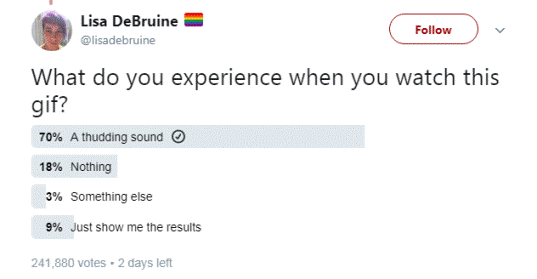 Ceea ce este ciudat despre GIF-ul silențios este faptul că mulți oameni au spus că pot auzi un zgomot, atunci când în săritură stâlpul lovește pământul. Dr. Lisa DeBruine, cercetător în psihologie, a pus pe Twitter GIF-ul și a cerut utilizatorilor ei să spună dacă aud vreun sunet atunci când vizionează GIF-ul. Aproximativ 70% dintre cei care au răspuns au spus că au auzit un sunet atunci când stâlpul de electricitate din mijloc lovește pământul. Numai 18% au spus că nu au auzit nimic, 3% au spus că au auzit altceva, iar 9% au spus că doresc doar să vadă rezultatele.