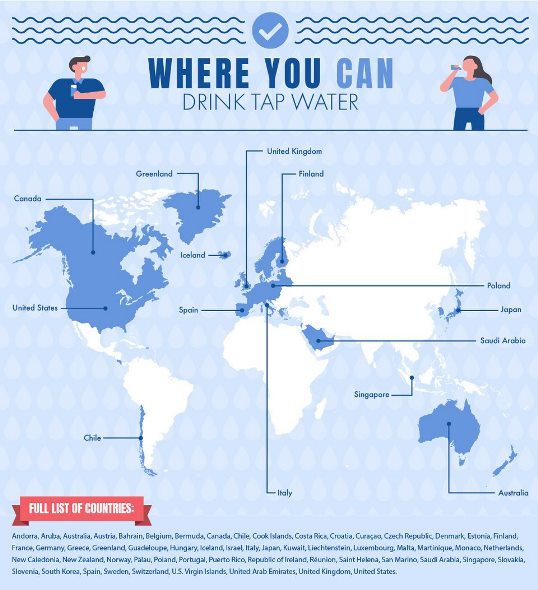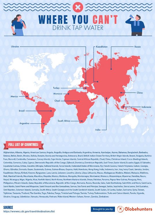 Globehunters, o companie turistică din Canada, a creat o hartă infografică, bazată pe informații obţinute de la Centrele pentru Controlul Bolilor, despre ţările din lume în care turiștii ar trebui și nu ar trebui să bea apă de la robinet. Toate ţările au fost analizate şi, dintre acestea, s-a creat o listă de 187 de țări în care turiștii ar trebui să evite apa de la robinet. ATENŢIE! Asta nu înseamnă neapărat că apa din acele locuri este nesigură, ci doar că organismul dvs. nu va fi obişnuit pentru apele din acele zone.