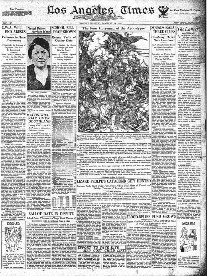 Sub marele şi modernul Los Angeles s-ar afla un oraş reptilian! Sub catacombele pierdute ale marii metropole americane s-ar ascunde o rasă de oameni extrem de avansată tehnologic şi intelectual! Afirmaţia nu-mi aparţine mie şi nici vreunui blogger pus pe farse, ci o putem găsi în ziarul „Los Angeles Times” din 29 ianuarie 1934. Prima pagină a ziarului o găsiţi AICI, iar articolul cu pricina poartă numele de „În descoperirea oraşului-catacombă al oamenilor-şopărlă”.