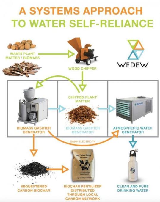 Componenta a doua a lui WeDew este un gazificator de biomasă, ce asigură energia necesară pentru a finaliza procesul. Se ia material organic, cum ar fi așchii de lemn sau coji de nucă de cocos, care se vaporizează pentru a produce căldură și umiditate, ceea ce reprezintă de fapt mediul perfect pentru ca dispozitivul de colectare a apei să funcționeze la cel mai eficient. Împreună, ele lucrează în armonie excelentă pentru a crea apă din aer.