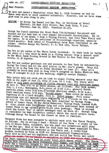 „(…) Fiinţele din spaţiu i-au vizitat pe inginerii lui Tesla de multe ori şi ne-au spus că Tesla era un venusian, adus pe pământ ca bebeluş în 1856 şi lăsat domnului şi doamnei Tesla într-o provincie montană îndepărtată din Iugoslavia de azi” (“…The Space People have visited the Tesla engineers many times, and have told us that Tesla was a Venusian, brought to this planes as a baby, in 1856, and left with Mr. And Mrs. Tesla in a remote mountain province in what is now Yugoslavia.”)