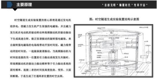 „Dispozitivul poate distorsiona timpul și spațiul, poate controla debitul timpului, poate străbate bariera timpului și spațiului și poate fi utilizat pe scară largă pentru călătorii în timp, călătorii interstelare, extinderea vieții etc. Proiectul intenționează să selecteze o locație în China și să închirieze o suprafață de aproximativ 16 acri pentru a construi o bază de experimente științifice. Se așteaptă ca dispozitivul să poată obţină cu succes rezultate la 7-12 luni după începerea experimentului”.